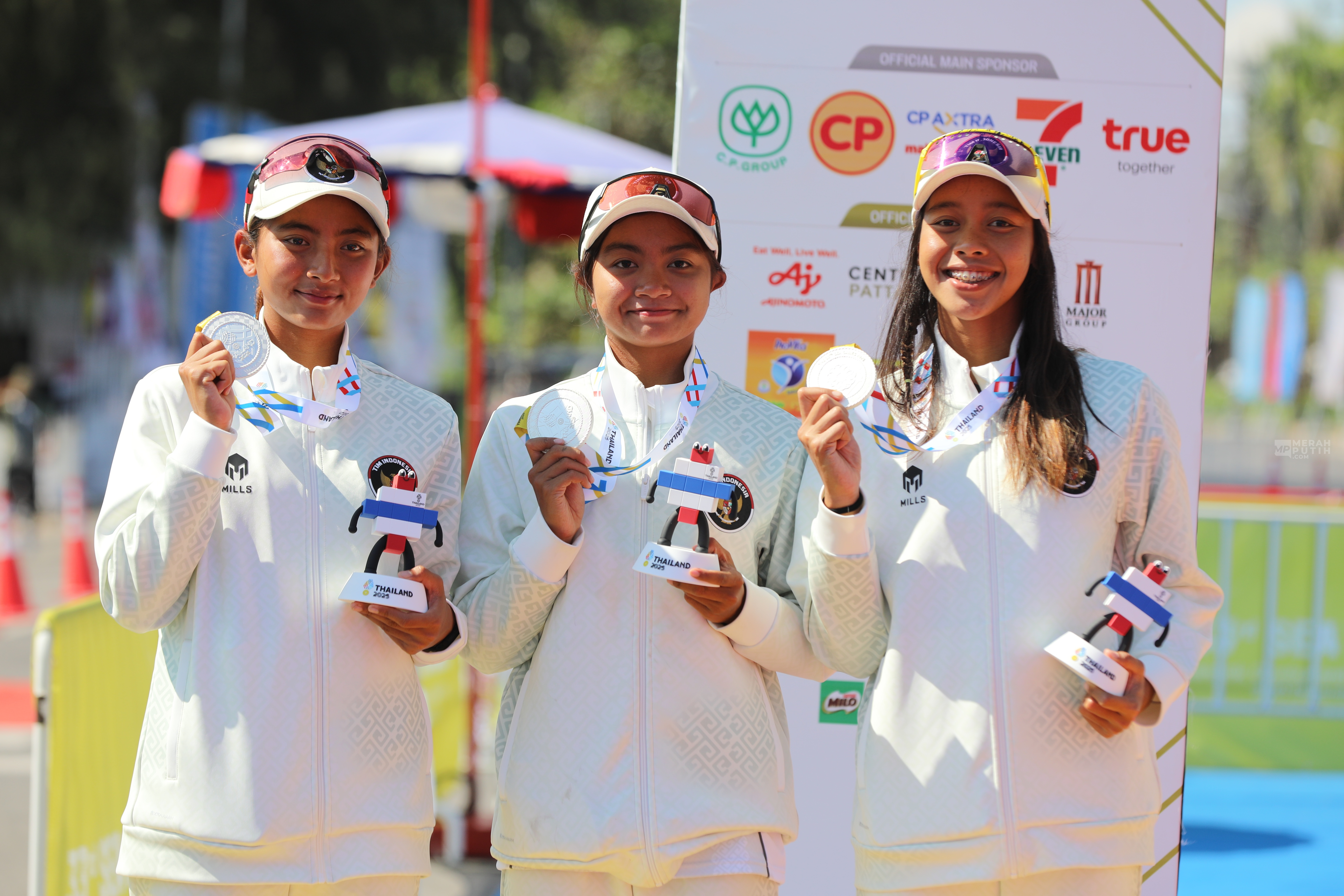 Merahputih.com - Atlet Triathlon Putri Indonesia, Renata Berliana Aditya,Martina Ayu Pratiwi dan Kayla Nada Shafa meraih medali perak nomor Women's Triathlon Team Relay di di Learn Mae Phim Beach, Klaeng Ditrict Rayong, Chon Buri, Thailand, Rabu (17/12/2025).