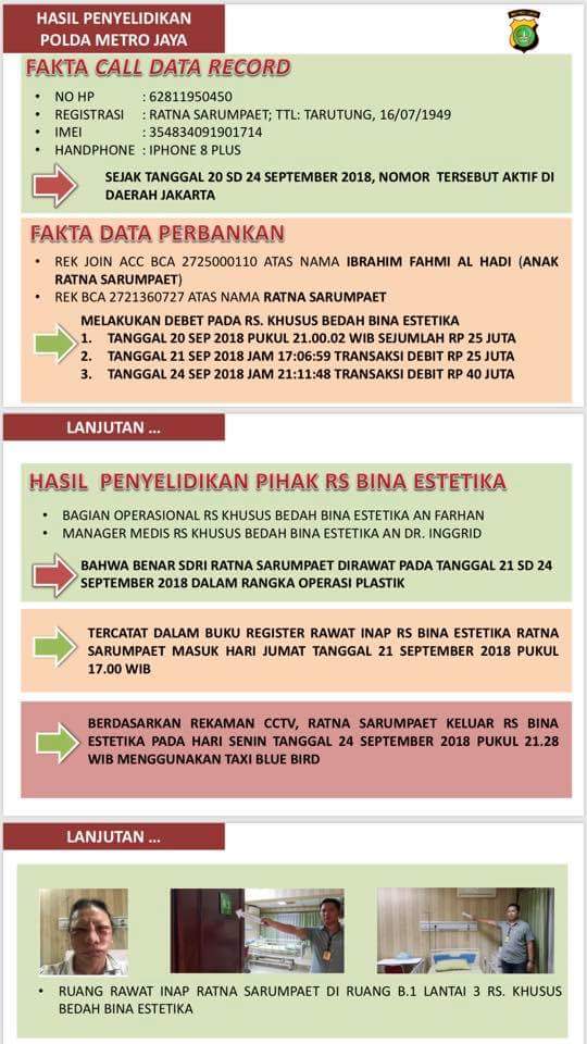 Sementara itu, Polda Metro Jaya mengungkapkan bahwa pada tanggal 20-24 September 2018, nomor ponsel Ratna Sarumpaet aktif di Jakarta. Selain itu, data perbankan juga memperlihatkan bahwa mertua Rio Dewanto itu melakukan debet di Rumah Sakit Bina Estetika pada tanggal yang sama.