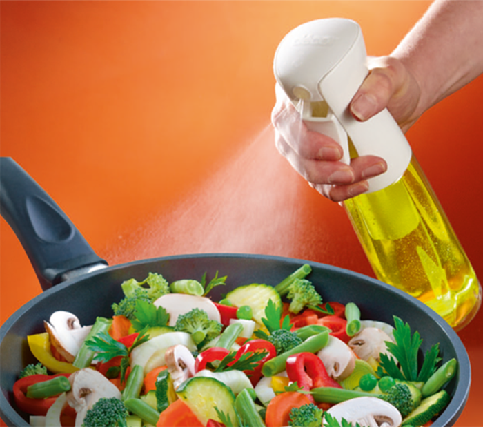 Sebuah oil sprayer memungkinkn Anda memasak dengan lemak dan cara yang sehat juga efisien. Anda dapat mengisi sprayer dengan pilihan Anda minyak, zaitun ataupun kanola.