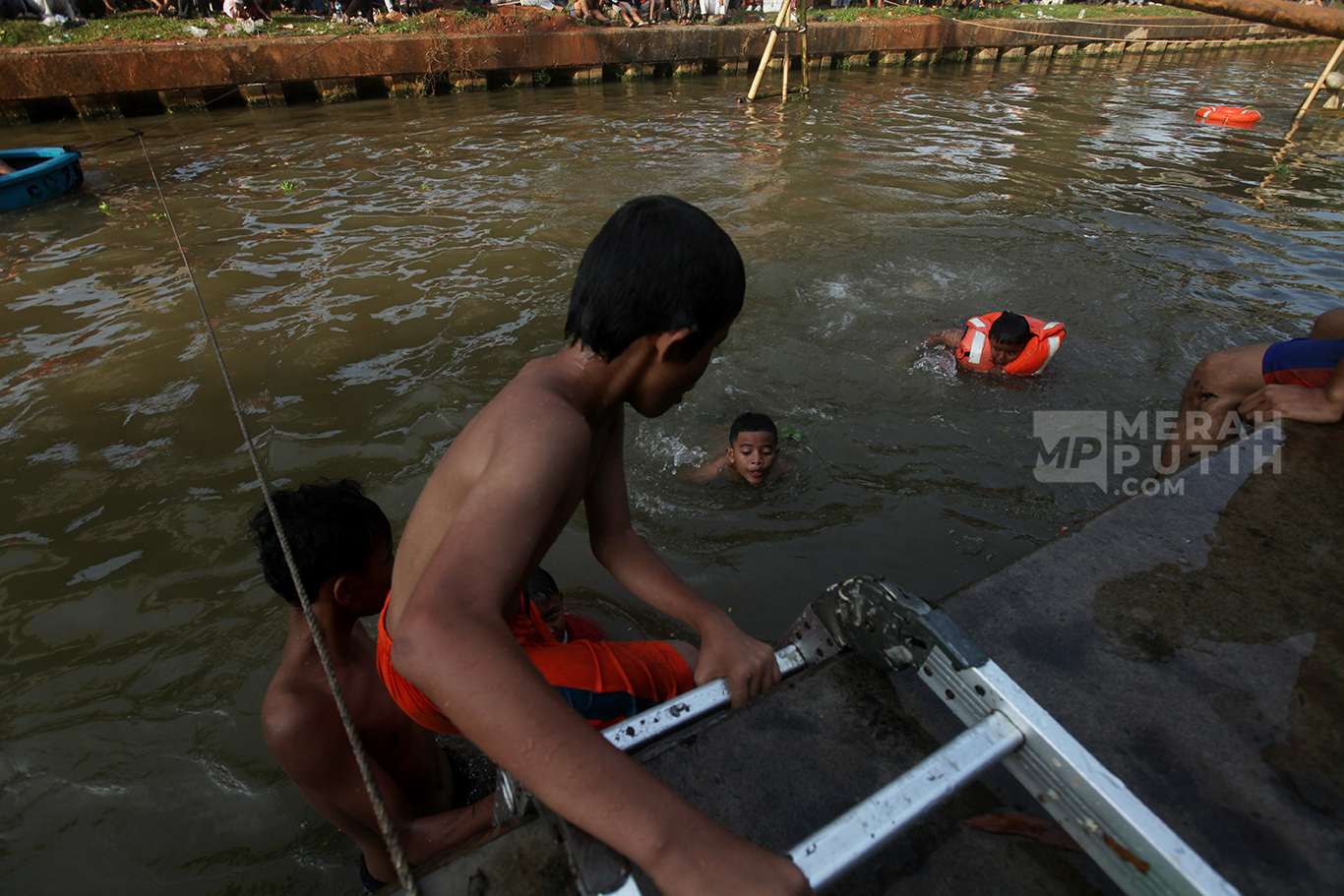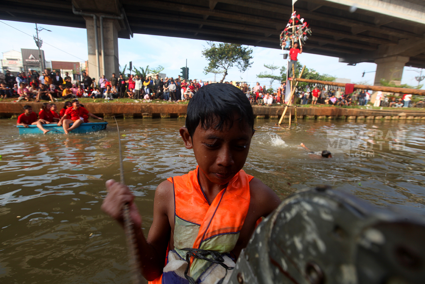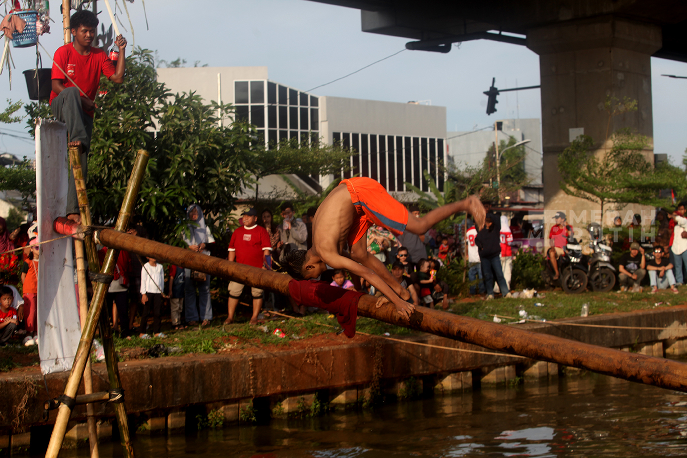 Lomba Panjat Pinang di Kalimalang diikuti oleh puluhan warga sekitar, baik anak-anak maupun dewasa. Lomba panjat pinang memperebutkan hadiah utama berupa dua unit sepeda dan tiga unit sepeda motor listrik yang merupakan pemberian dari Wakil Presiden RI Gibran Rakabuming Raka. Peringatan HUT Ke-80 Kemerdekaan RI mengusung tema "Bersatu, Berdaulat, Rakyat Sejahtera, Indonesia Maju". (MP/Didik Setiawan).