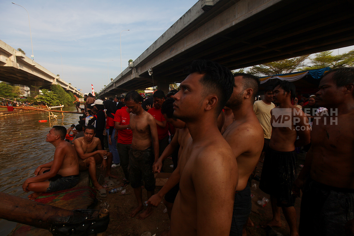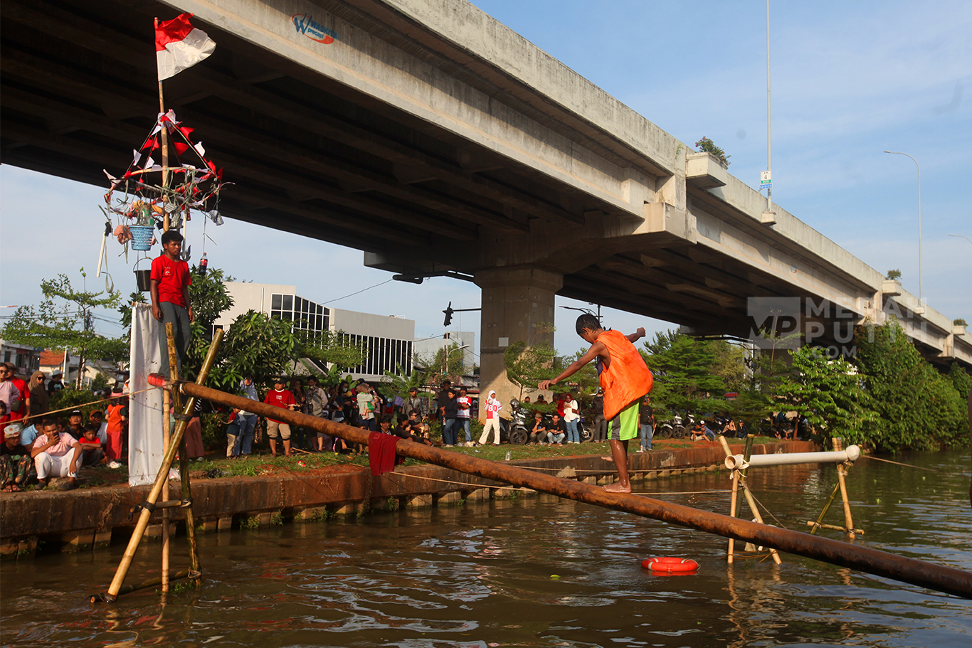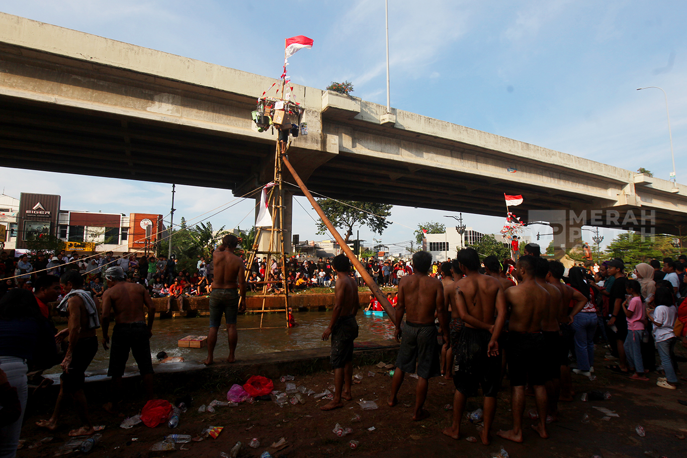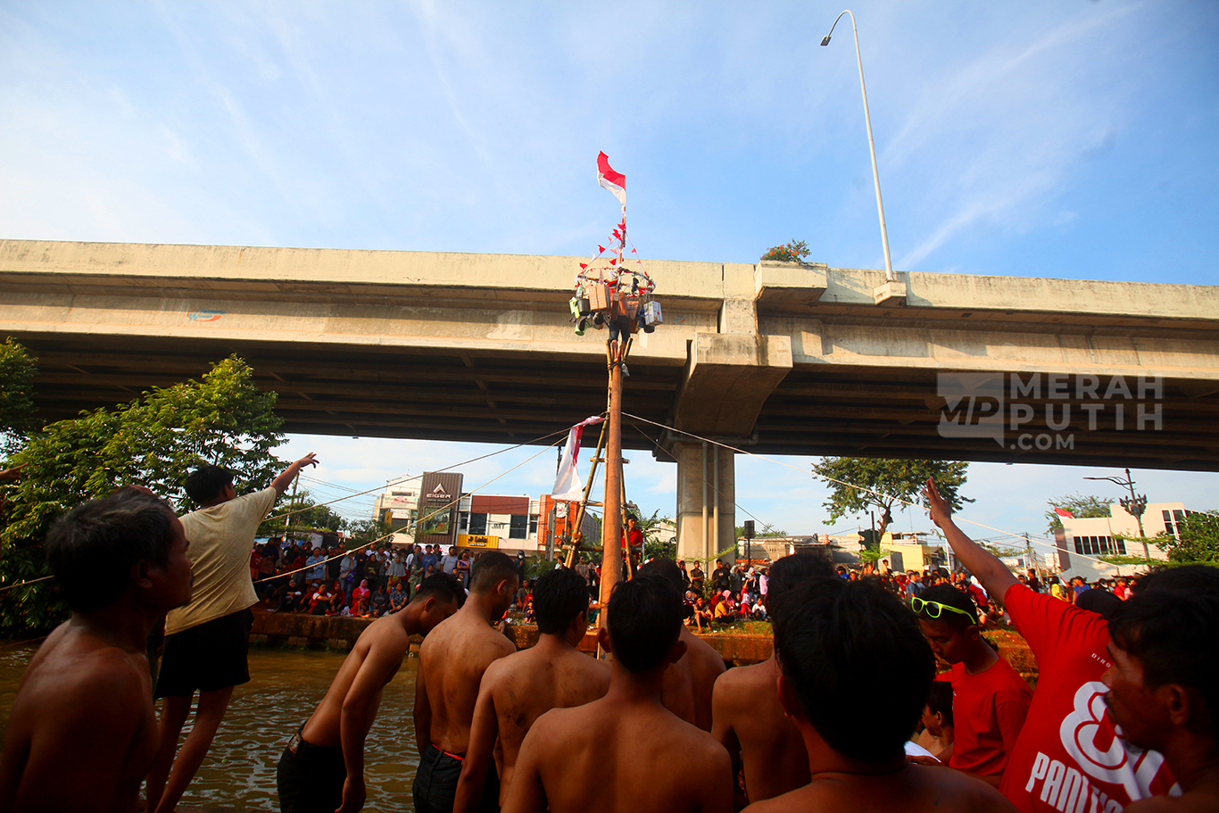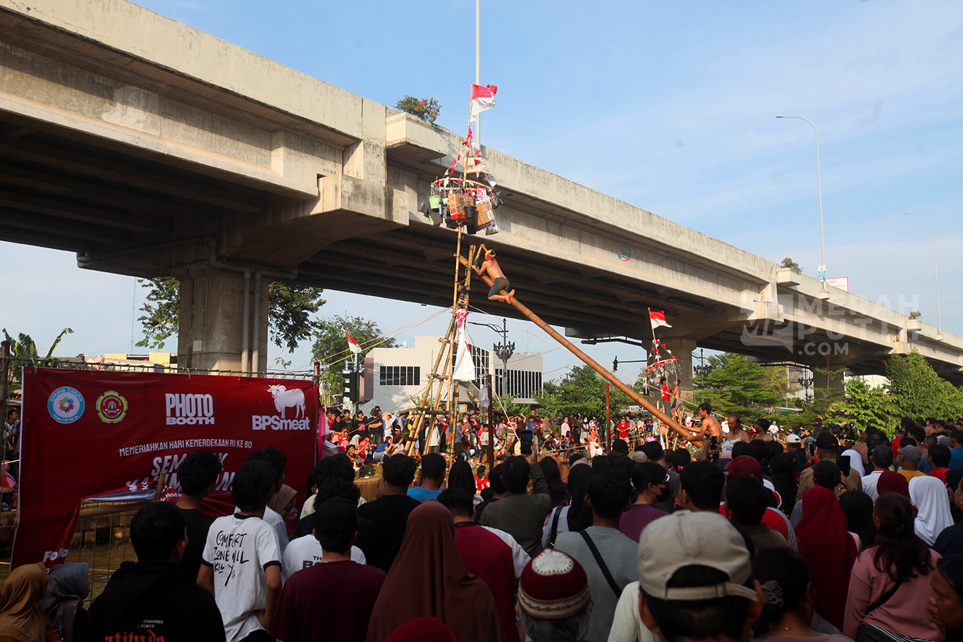 Semarak Lomba Panjat Pinang Meriahkan HUT Ke-80 Kemerdekaan RI di Kalimalang Jakarta