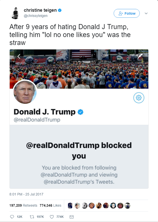 SAKING seringnya memberikan kritikan pedas ke presiden Amerika Serikat, Donald Trump, seorang peragawati, Chrissy Teigen resmi diblokir oleh akun Twitter Donald Trump.