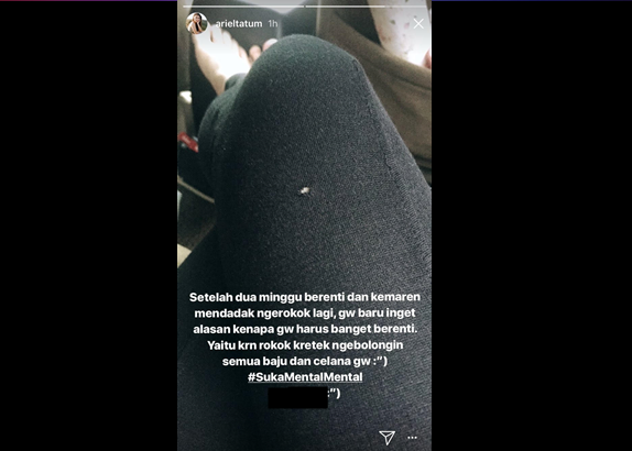 "Setelah dua minggu berhenti dan kemarin mendadak ngerokok lagi, gue baru inget alasan kenapa gue harus banget berhenti. Yaitu karena rokok kretek ngebolongin semua baju dan celana gue," tulis Ariel Tatum.
