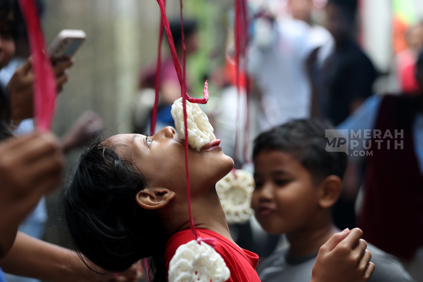 Keseruan anak-anak memperingati HUT ke-80 Kemerdekaan RI dengan mengikuti lomba makan kerupuk yang merupakan salah satu dari aneka perlombaan khas 17an.