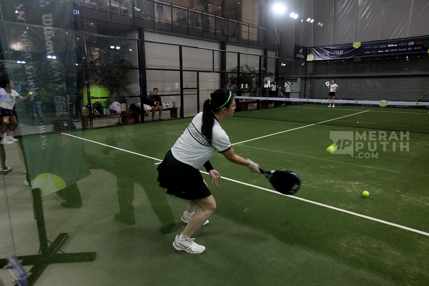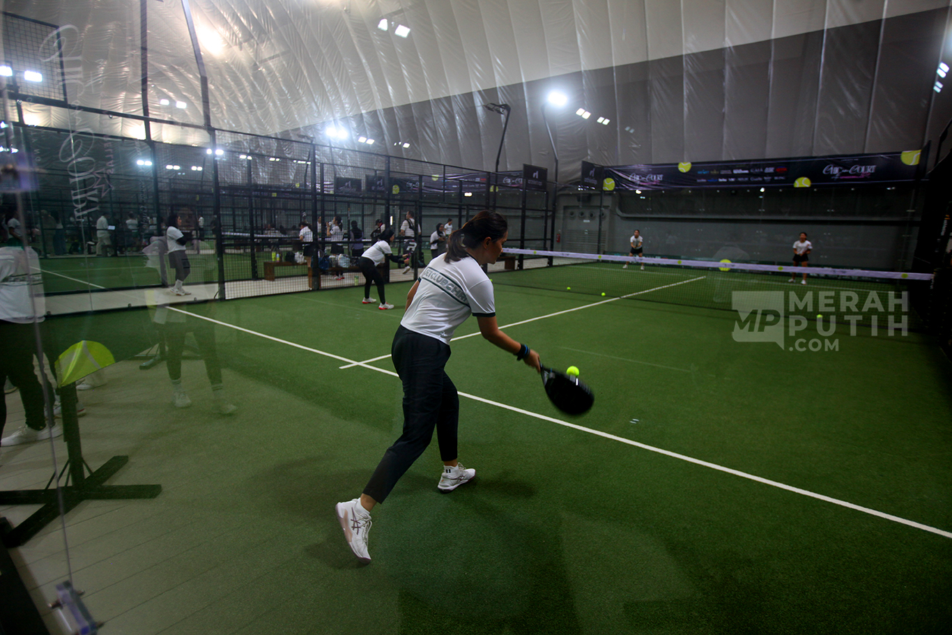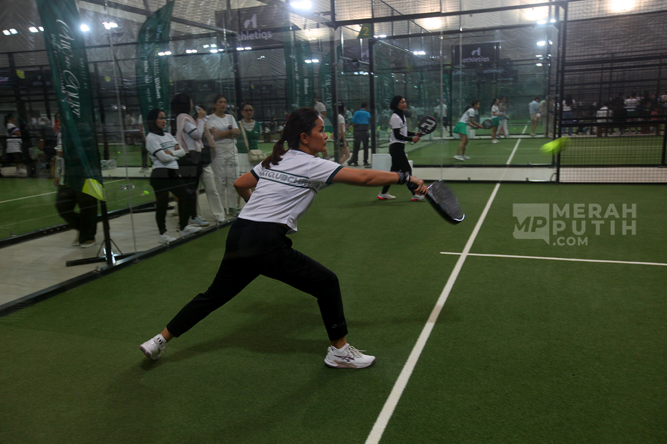 Merahputih.com - Pemain memukul bola dalam turnamen Padel Chic and Court Ladies Low Bronze Double di Athletiqs Airdome, Kawasan Bendungan Hilir, Jakarta Pusat, Minggu (5/10/2025).