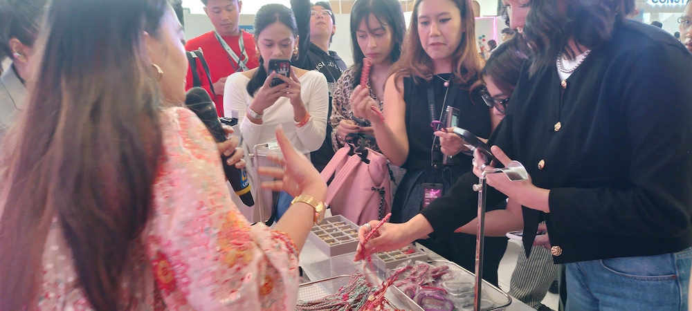 Laras menunjukan cara membuatnya. Peserta hanya perlu memasukan beads di tali yang diinginkan. Bisa dicampur dengan bunga enamel yang sudah ada. Tak lupa dikaitkan ke carabiner yang ada.