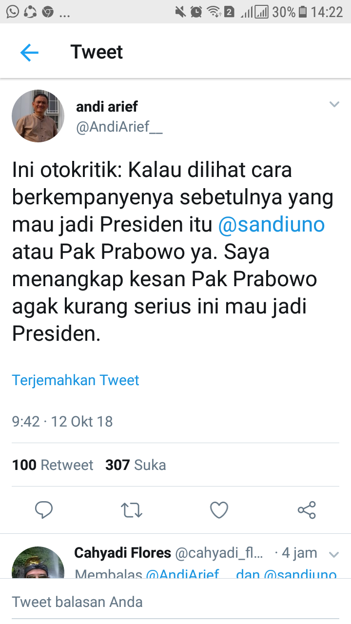"Ini otokritik: Kalau dilihat cara berkempanyenya sebetulnya yang mau jadi Presiden itu @sandiuno atau Pak Prabowo ya. Saya menangkap kesan Pak Prabowo agak kurang serius ini mau jadi Presiden," kicau Andi Arief melalui akun twitternya @AndiArief_, Jumat (12/10).