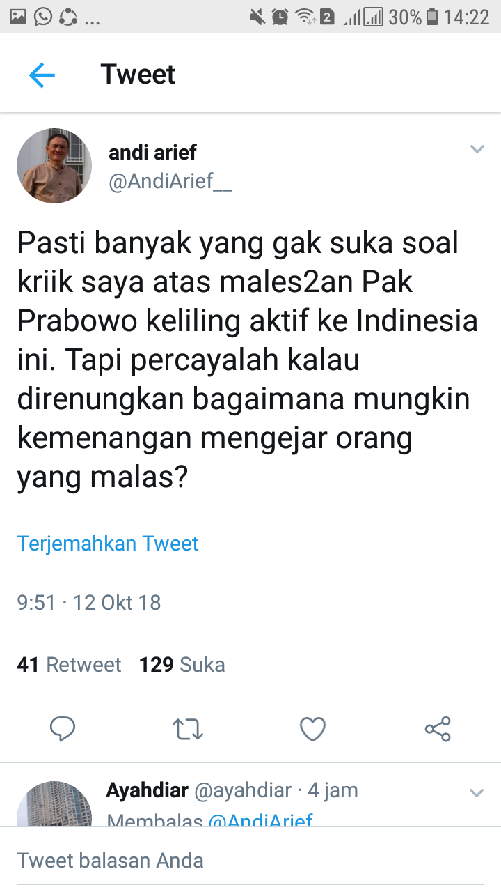 Andi menyadari bakal banyak pihak yang tidak suka atas kritiknya terhadap aksi malas-malasan calon presiden nomor urut 02 itu berkampanye keliling Indonesia secara aktif. "Tapi percayalah kalau direnungkan bagaimana mungkin kemenangan mengejar orang yang malas?" ucapnya.
