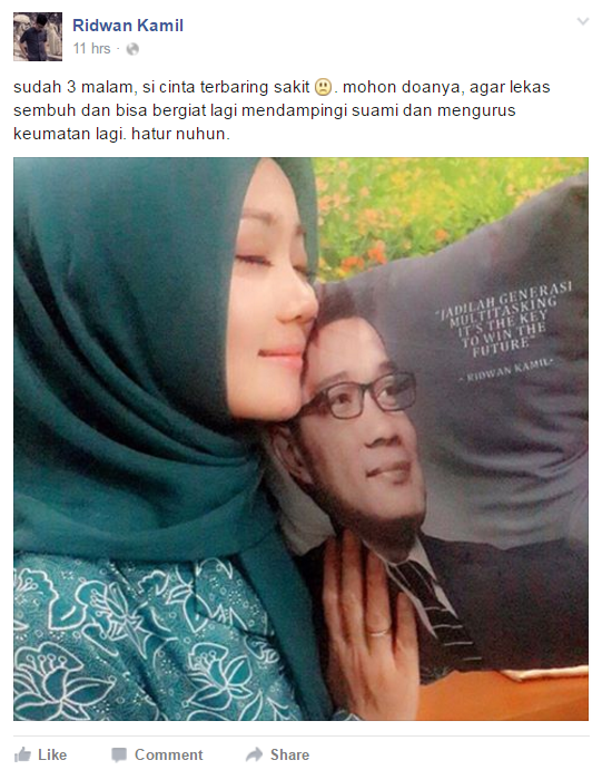 Kecemasan dan kegalauan Ridwan Kamil ini pun ia ungkapkan melalui postingan di akun facebooknya, bahkan Kang Emil, begitu Ridwan biasa disapa meminta doa pada para netizen untuk kesembuhan si Cinta.