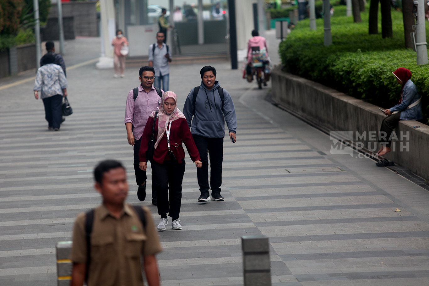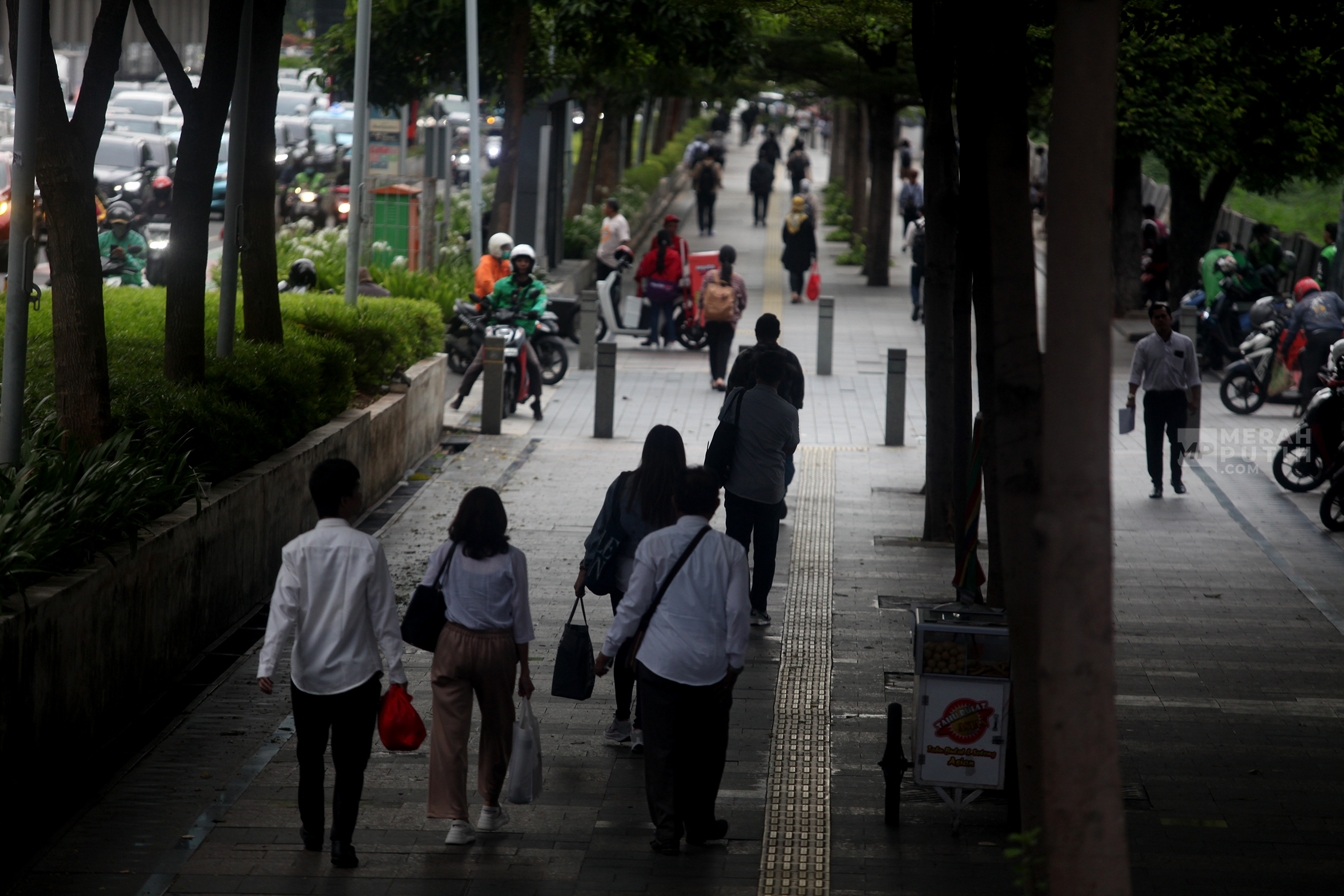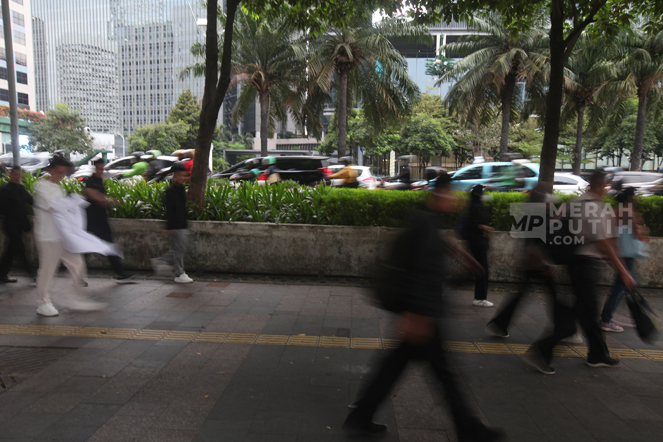 Merahputih.com - Aktivitas pekerja berjalan saat masa tenang Pilkada Serentak 2024 di trotoar jalan Sudirman-Thamrin, Jakarta, Senin (25/11/2024).