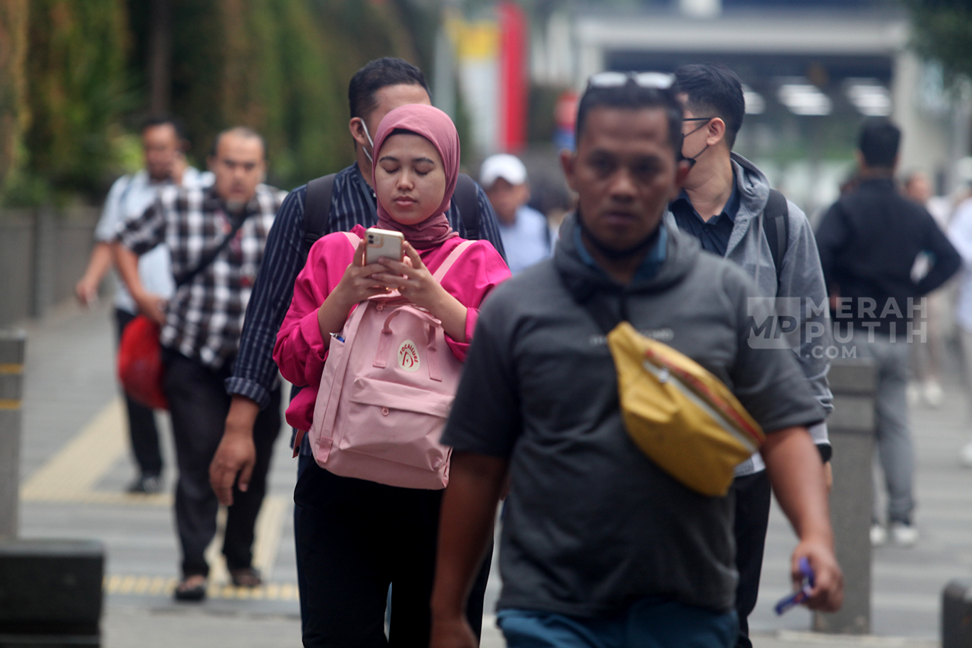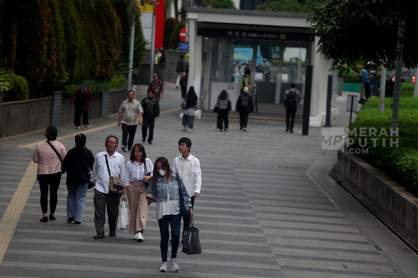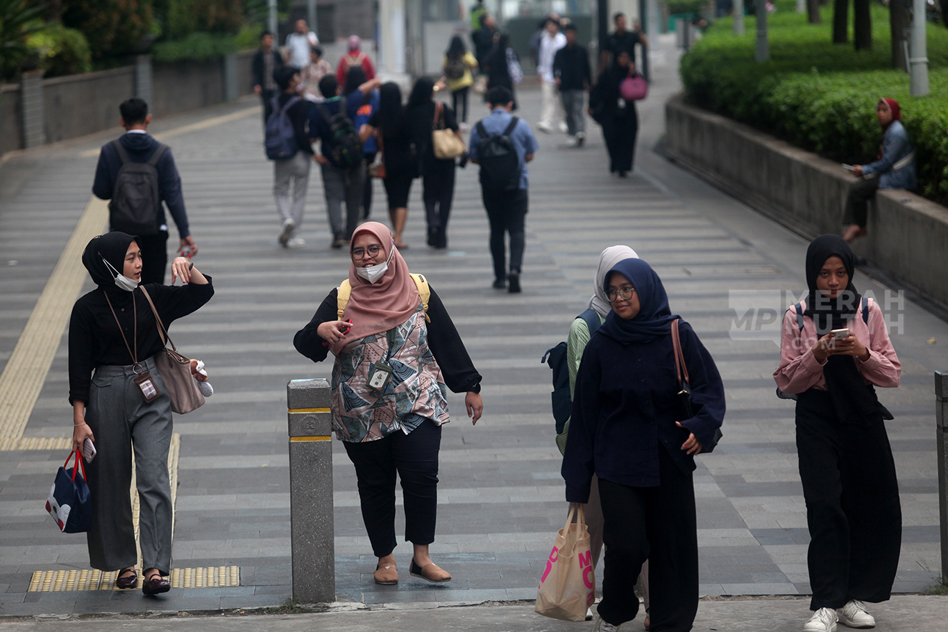 Merahputih.com - Aktivitas pekerja berjalan saat masa tenang Pilkada Serentak 2024 di trotoar jalan Sudirman-Thamrin, Jakarta, Senin (25/11/2024).