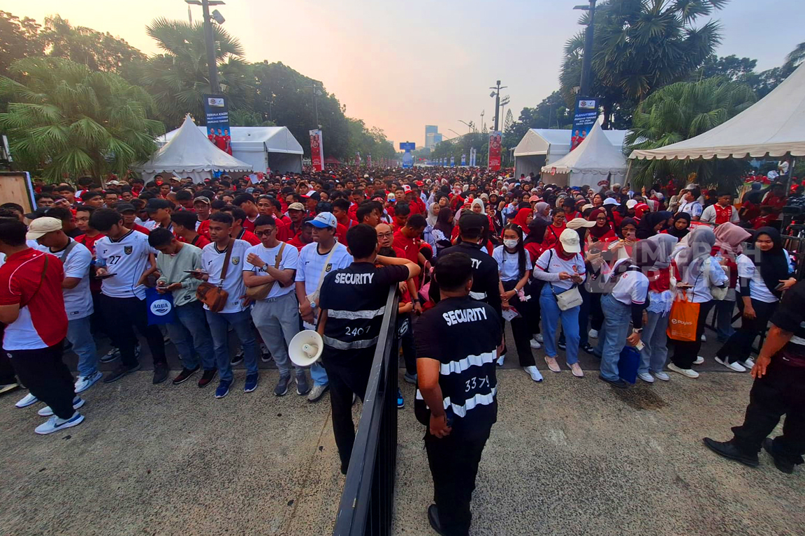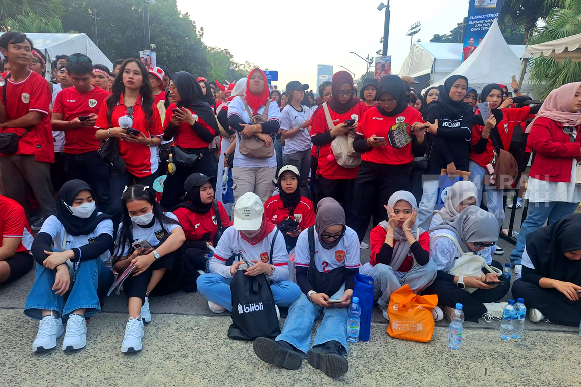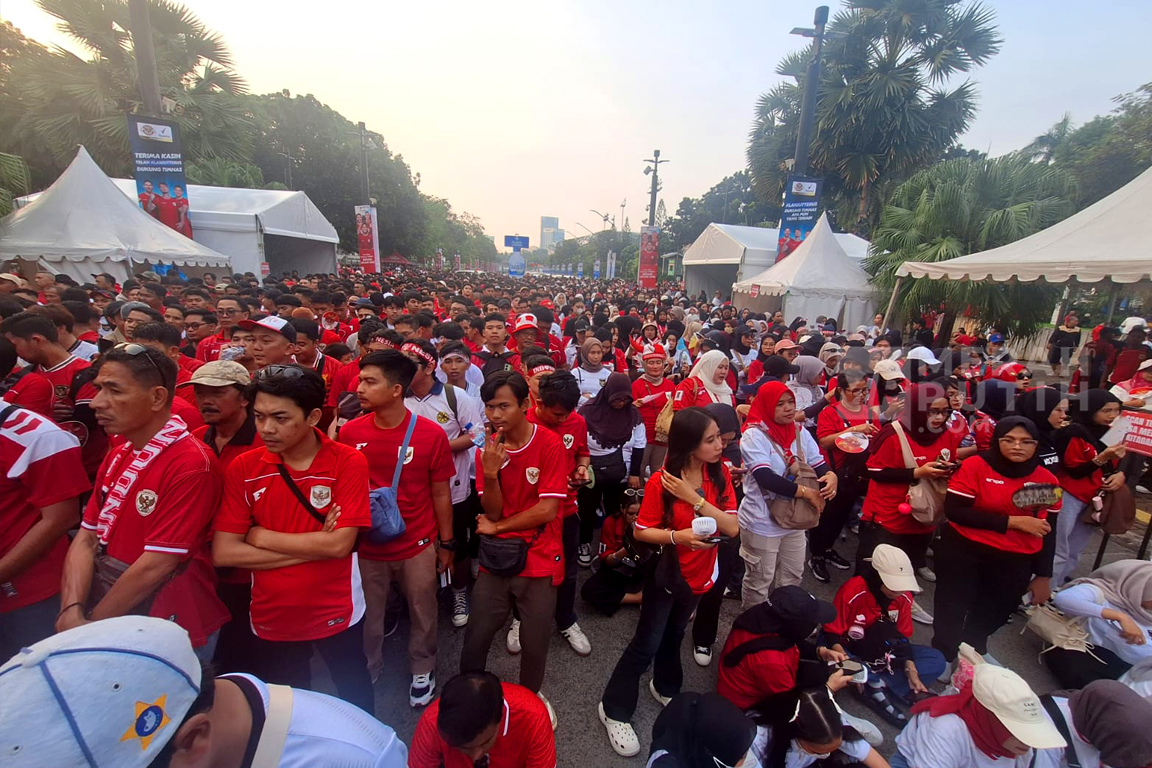 Supporter Timnas Indonesia mulai berdatangan ke area Stadion Utama Gelora Bung Karno (SUGBK) untuk mendukung Timnas Indonesia melawan China dalamlanjutan Kualifikasi Piala Dunia 2026 di Stadion Utama Gelora Bung Karno (SUGBK). Kick off Timnas Indonesia melawan China akan dilakukan pada 20.45 WIB.(MP/Didik Setiawan).