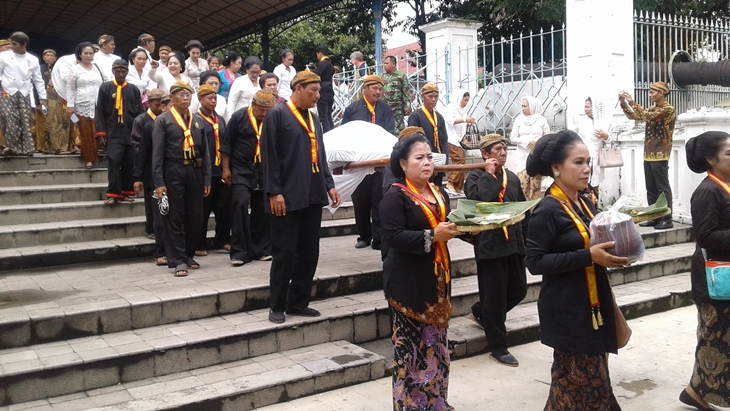 MerahPutih.com - Iring-iringan prajurit keraton terlihat keluar dari bangsal Gondorasan dan menuju ke Sitihinggil Keraton Kasunanan Solo, Kamis (25/1). Dalam iring-iringan tersebut, tampak para abdi dalam dan sentana keraton ikut ambil bagian. Sementara, di lain sisi terlihat sesuatu yang terbungkus dengan kain warna putih.
