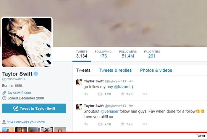 Beberapa tweet sempat diposting oleh para hacker tersebut melalui akun twitter Taylor Swift. Salah satunya yaitu “Go Follow my boy @Lizzard” dan “Shotout @veriuser follow him guys Fav when done for a follow :* :* love you all!!! Xx” .