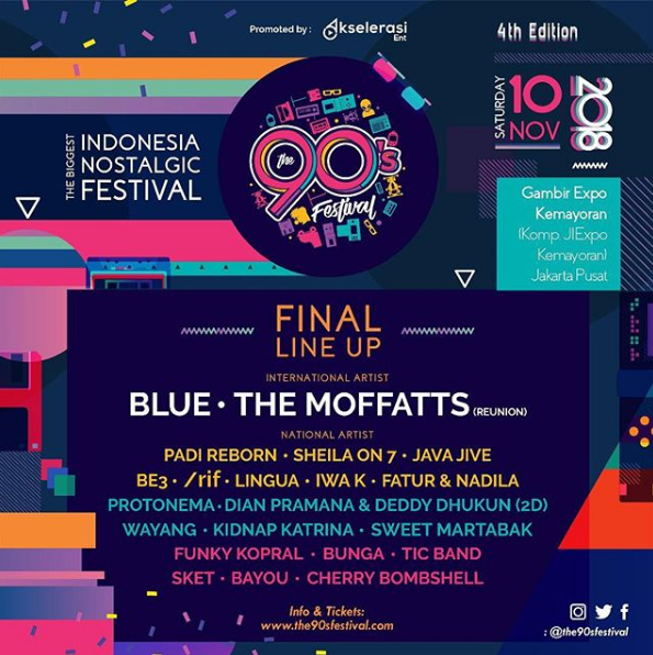 UNTUKU keempat kalinya 90's Festival digelar. Rencananya akan selenggarakan pada Sabtu, 10 November 2018, di Gambir Expo Kemayoran, Jakarta Pusat.