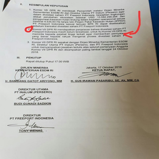 "Selanjutnya adalah penyelesaian administrasi, termasuk perizinan usaha pertambangan IUPK dari Kementerian ESDM. Izin ini membutuhkan clearance dari Kementerian LHK terkait isu lingkungan PTFI. Tanpa IUPK dan clearance KLHK berdasarkan agreement Inalum, tidak bisa menyelesaikan seluruh tahapan. Ini yang harus dipahami oleh Fraksi Partai Gerindra," katanya pula.