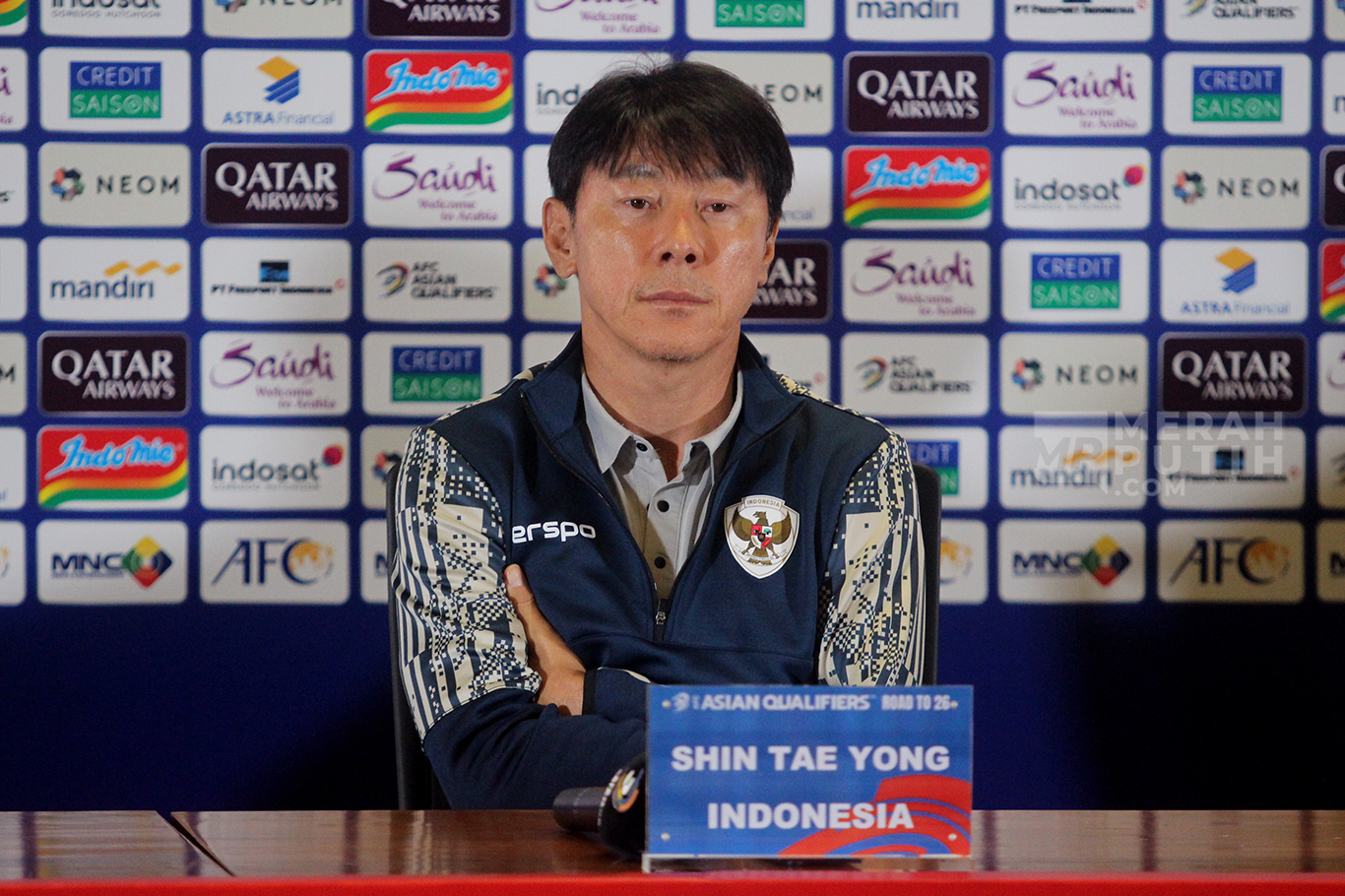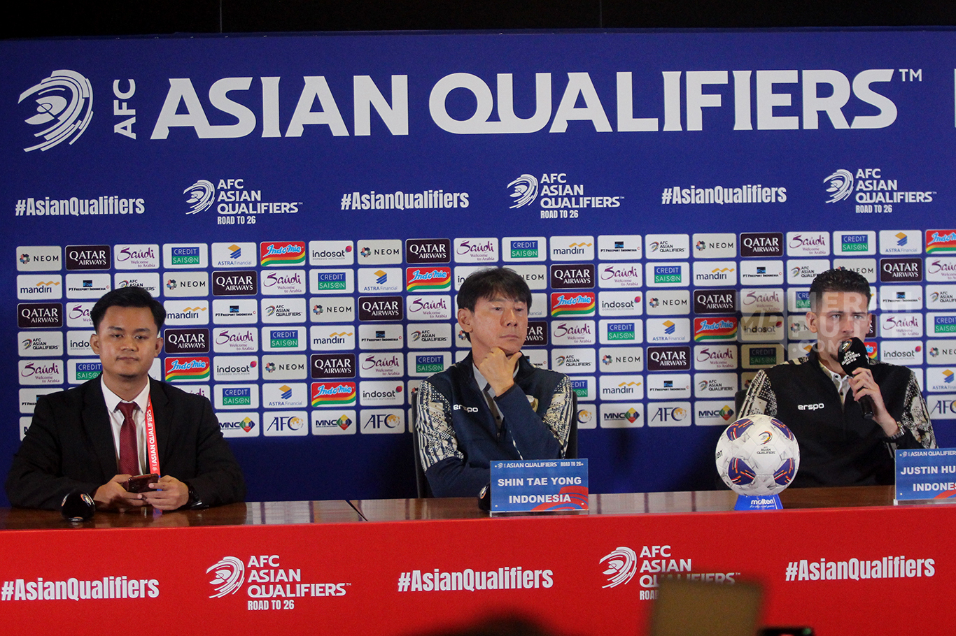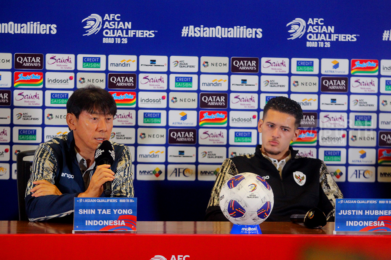 MerahPutih.com - Pelatih Timnas Indonesia, Shin Tae-yong bersama kapten Timnas Indonesia, Justin Hubner saat konferensi pers jelang laga kontra Australia di Stadion Utama Gelor abung Karno (SUGBK), Senayan, Jakarta, Senin (9/9/2024).