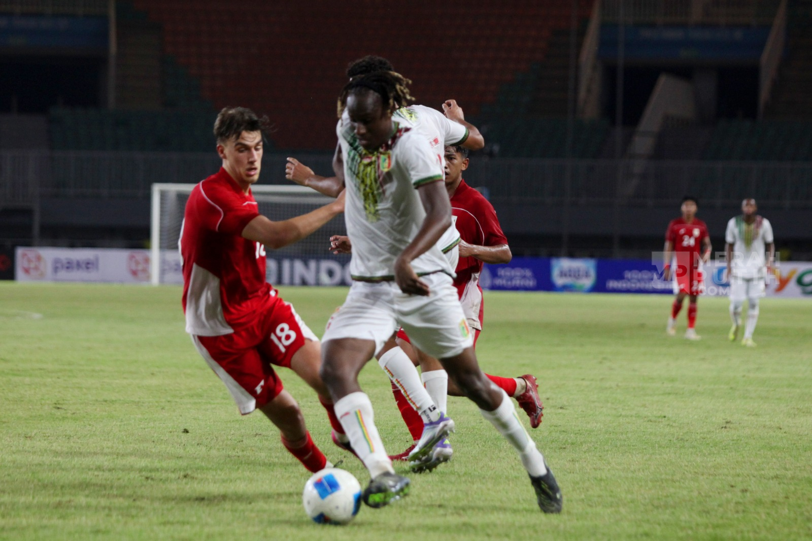 Sejak menit awal, Indonesia langsung mendapat tekanan dari permainan agresif Mali. Baru lima menit pertandingan berjalan, Sekou Doucoure membuka keunggulan untuk tim tamu melalui tandukan setelah menyambut umpan silang dari sisi kiri pertahanan Indonesia. Gol cepat tersebut membuat para pemain Indonesia terlihat gugup dan kesulitan mengembangkan permainan.