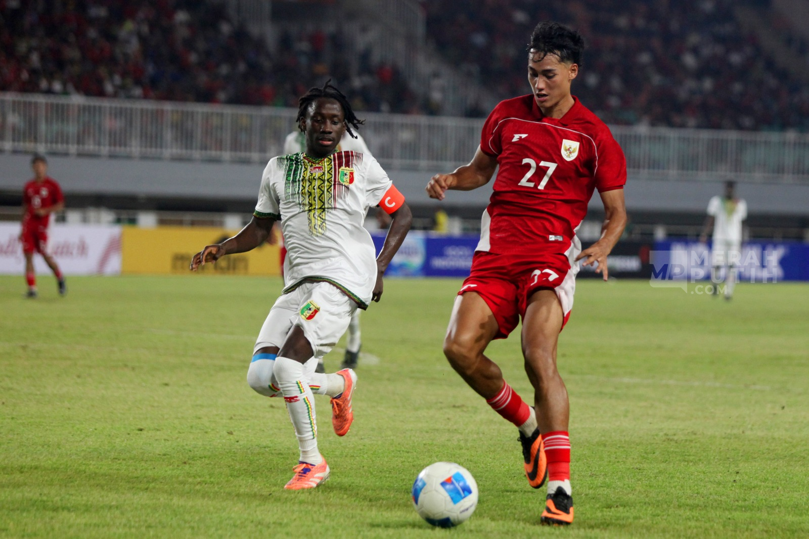 Merahputih.com - Pesepak bola Timnas U-22 Indonesia Rafael William Struick mencoba melewati pemain U-22 Mali Hamidou Makalou dalam pertandingan Persahabatan Internasional jelang SEA Games 2025 di Stadion Pakansari, Bogor, Jawa Barat, Sabtu (15/11/2025).