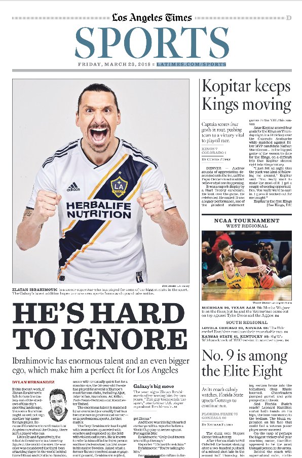Langkah Ibrahimovic ke LA Galaxy diumumkan dalam sebuah iklan di LA Times. Iklan di koran edisi Jumat (23/3) itu memuat satu halaman penuh dengan menyertakan kalimat menyapa warga Los Angeles.