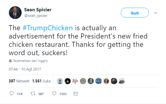 Akun milik pengguna Twitter lain, Sean Spicier, menyebutkan, "The #TrumpChicken sebenarnya adalah sebuah iklan untuk restoran ayam goreng baru presiden. Terima kasih telah menyampaikan kabar, suckers!" terangnya di Twitter.