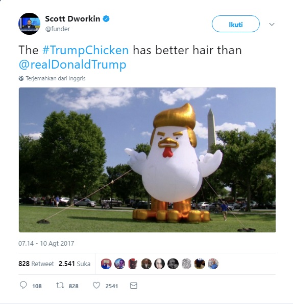 Warganet juga seakan berlomba menyampaikan komentar mereka lewat Twitter. "The #TrumpChicken memiliki rambut yang lebih baik dari @realdonaldtrump," tulis Scoott Dworkin (10/8) dalam akun Twitter miliknya.