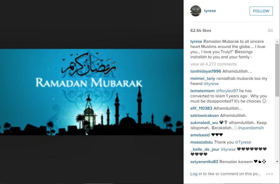 Tak hanya itu, Sahabat mendiang Paul Walker tersebut mengunggah gambar bernuansa Islam yang bertuliskan "Ramadan Mubarak". Tyrese Gibson pun antusias tampak senang menyambut datangnya bulan suci Ramadan.