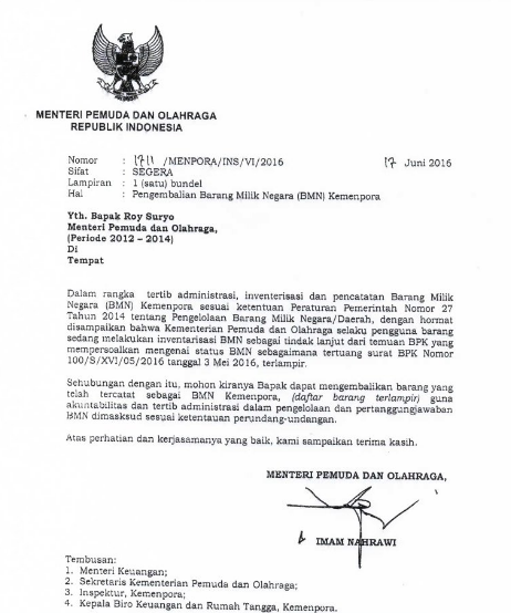 Lalu, kini tersebar surat Kemenpora yang ditandatangi langsung oleh Menpora Imam Narawi untuk Roy tertanggal 17 Juni 2016. Surat itu terlampir item barang, jumlah, dan harga. Barang-barang itu disebut belum dapat diinventarisasi di rumah dinas jabatan menteri tahun 2013-2014.