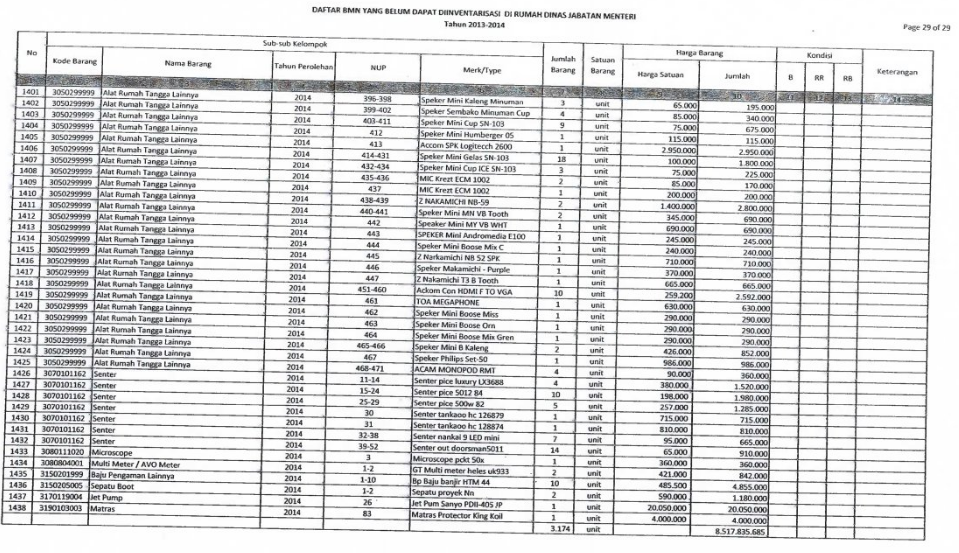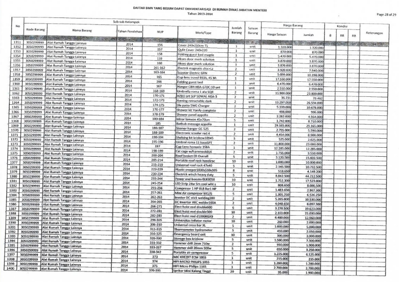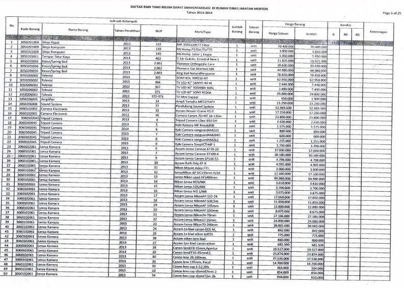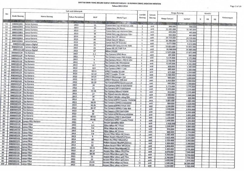 Ada pula Karpet Turki impor 24 meter Rp 69.480.000, Televisi Merk Sony KDL 70R550-HT Rp 62.950.000, Kamera Digital tipe DV Sony GV-HD 700E Rp 53.855.000, Kamera Nikon D-80035.9x240 Rp 46.500.000 dan Lenca Carl Zeiss Nikon 15 mm Rp 40.800.000.