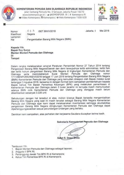 Dari keterangan Gatot, artinya Roy belum mengembalikan semua barang yang dibawa selama menjabat sebagai menpora. Itulah kemudian diterbitkan surat bernomor 513/SET.BIII/V/2018 tertanggal 1 Mei 2018.