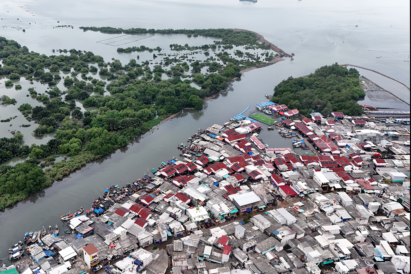 Suasana pesisir Jakarta di Kawasan Muara Angke, Penjaringan, Jakarta Utara, Rabu (18/12/2024). Dinas Sumber Daya Air (SDA) DKI Jakarta bergerak cepat melakukan penanganan sementara terhadap sejumlah titik tanggul yang bocor di kawasan pesisir Jakarta. Kebocoran tanggul tersebut menyebabkan air laut melimpas ke daratan, hingga mempengaruhi kondisi banjir rob yang dipicu oleh fenomena bulan purnama.