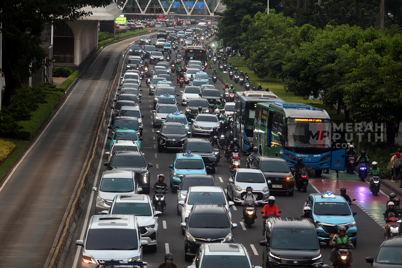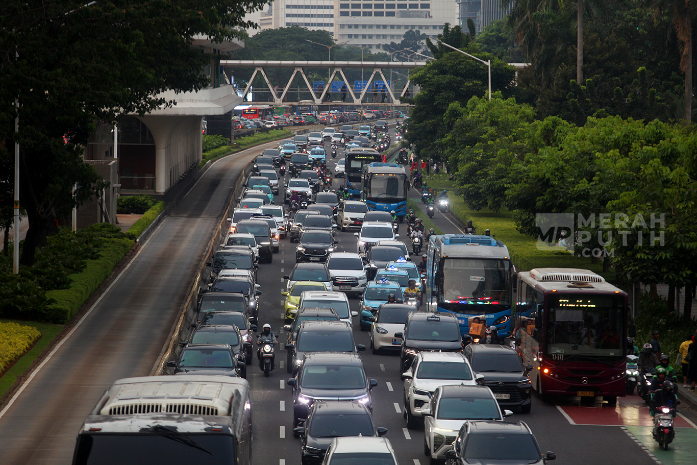 Merahputih.com - Bus Transjakarta melintasi jalur busway Jalan Sudirman-Thamrin, Kawasan Bendungan Hilir, Jakarta Pusat, Jum'at (10/10/2025).