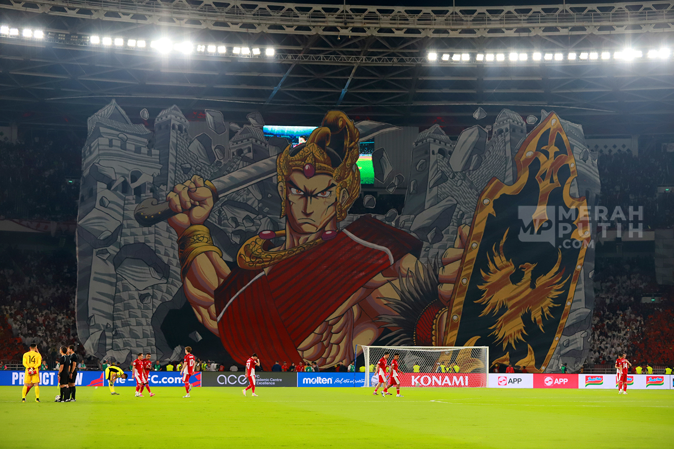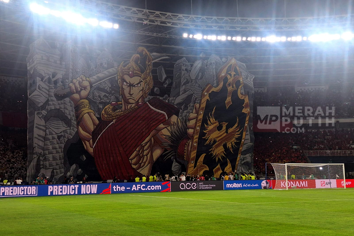 Merahputih.com - Koreografi Gatot Kaca membentang di tribun mendukung laga Timnas Indonesia melawan China di Stadion Utama Gelora Bung Karno (SUGBK), Senayan, Jakarta, Kamis (5/6/2025).