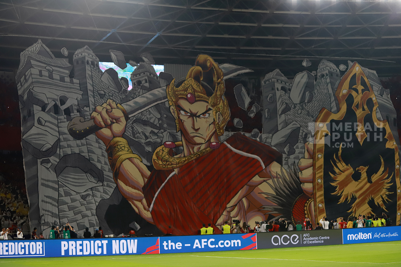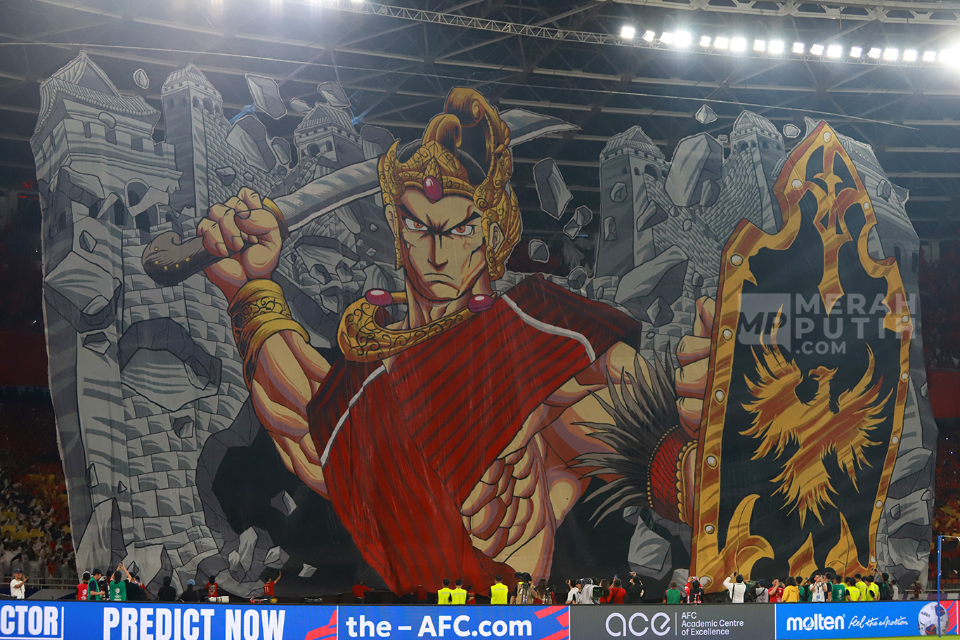 Koreografi apik yang diinisiasi La Grande Indonesia dan Ultras Garuda terbentang menjelang pertandingan pamungkas melawan China. Koreografi membentang saat lagu kebangsaan Indonesia Raya. Koreografi Gatot Kaca membakar semangat para pemain Timnas Indonesia. (MP/Didik Setiawan).