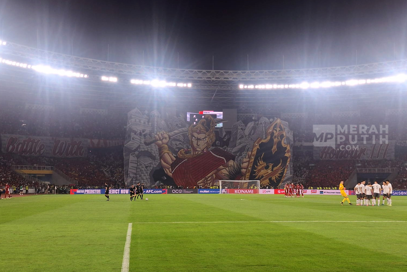 Kelompok supporter Timnas Indonesia La Grande Indonesia dan Ultras Garuda membuat koreografi Gatot Kaca gahar di tribun untuk mendukung laga Timnas Indonesia menjamu China dalam aga lanjutan Grup C putaran ketiga Kualifikasi Piala Dunia 2026 Zona Asia, Kamis (5/6/2025) malam.