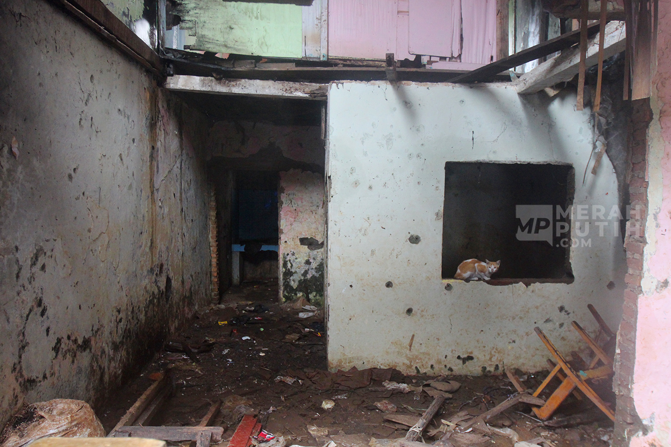 MerahPutih.com- Warga kampung Zombie duduk di lantai atas perumahan kosong Kampung Zombie di Bantaran Anak Kali Ciliwung, Cililitan, Jakarta Timur, Rabu (12/6/2024).