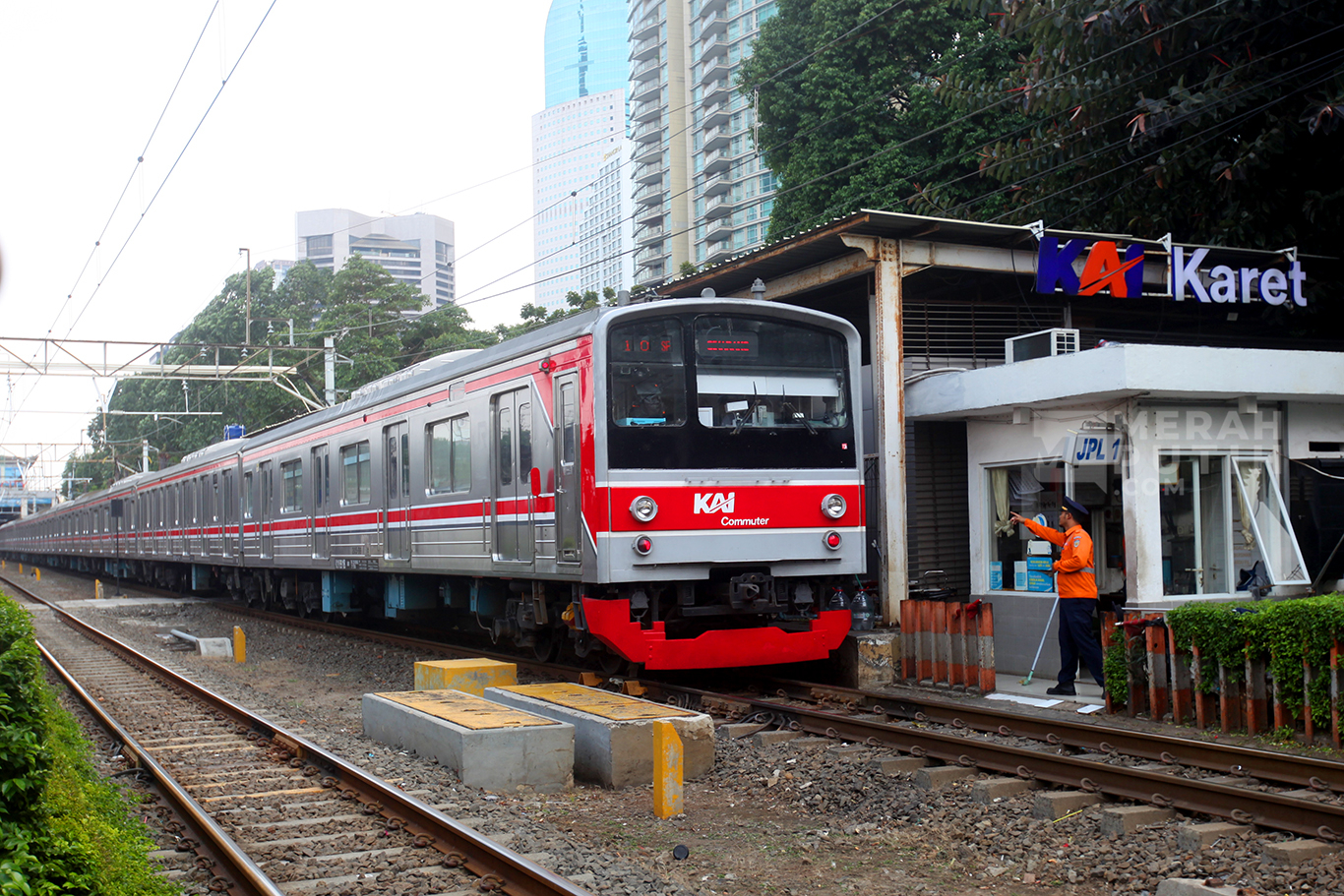 Merahputih.com - Rangkaian KRL/ Commuter Line Jabodetabek saat melintasi Stasiun Karet di Jalan K.H. Mas Mansyur, Kebon Melati, Tanah Abang, Jakarta Pusat, Kamis (2/1/2025).