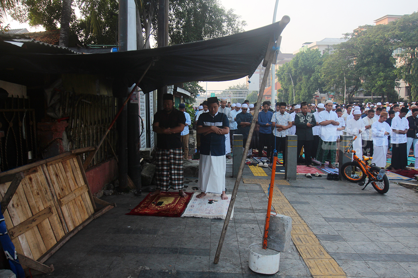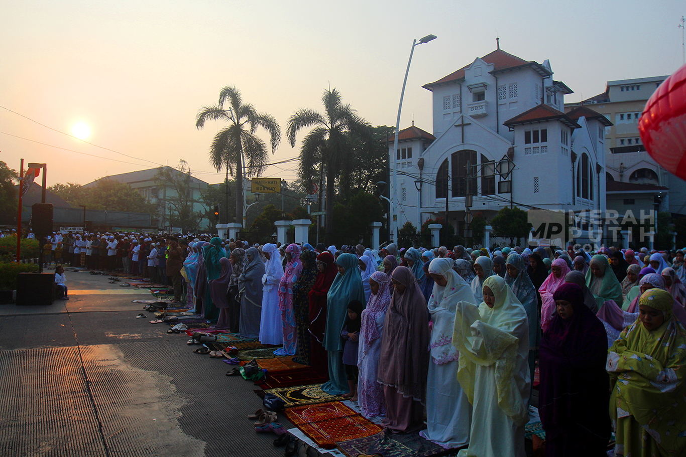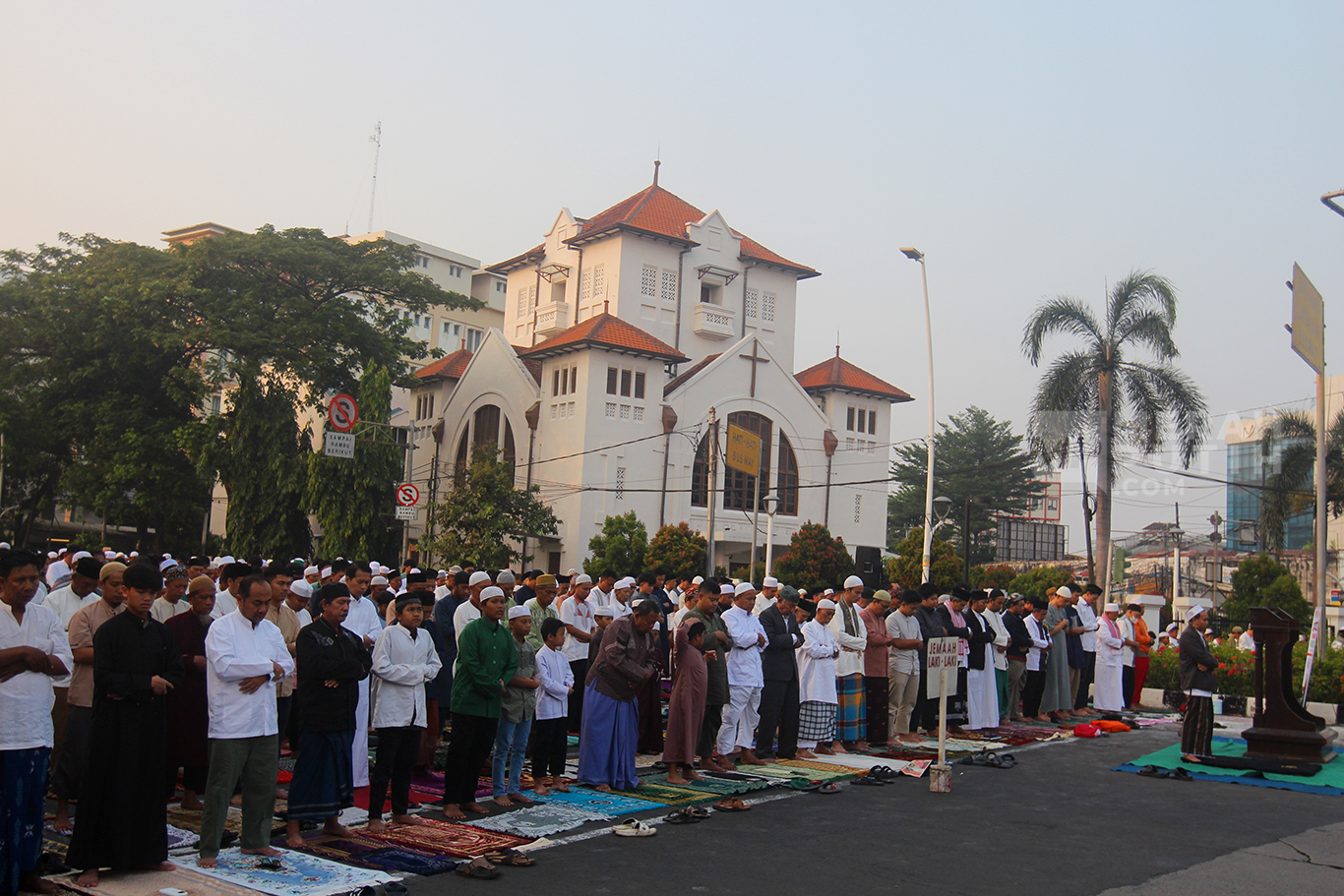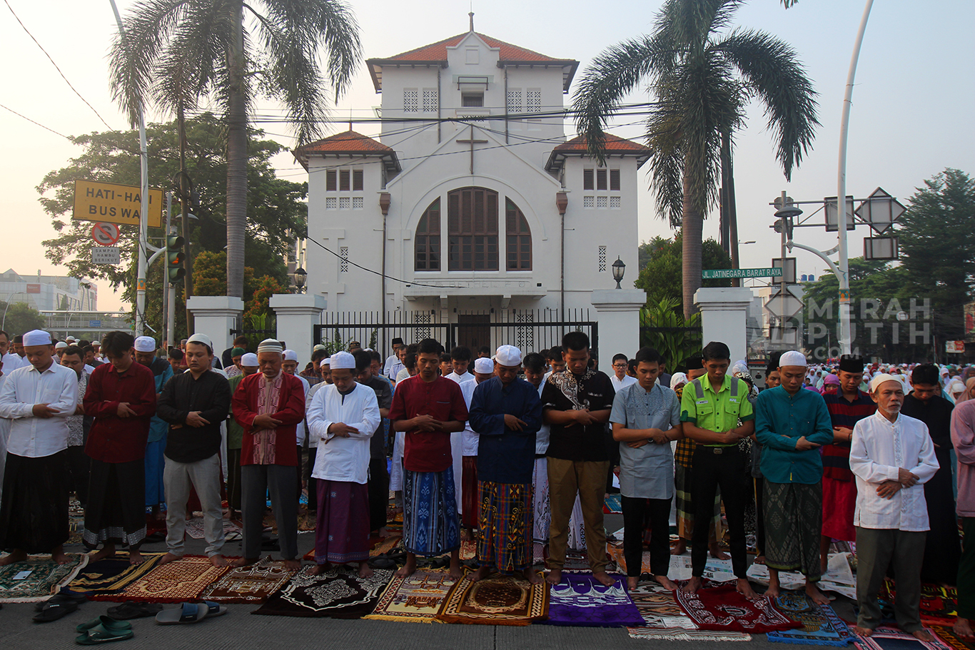 Warga Jatinegara menggunakan Jalan samping kanan dan kiri Gereja GPIB Koinonia yakni Jalan Jatinegara Barat dan Jalan Matraman Raya, Jatinegara, Jakarta Timur untuk melaksanakan ibadah di hari-hari besar seperti salat Idul Fitri dan Salat Idul Adha. Pelaksanaan ibadah salat di sekitaran Gereja Koinonia ini merupakan bukti nyata toleransi keberagaman umat beragama di Indonesia. (MP/Didik Setiawan).