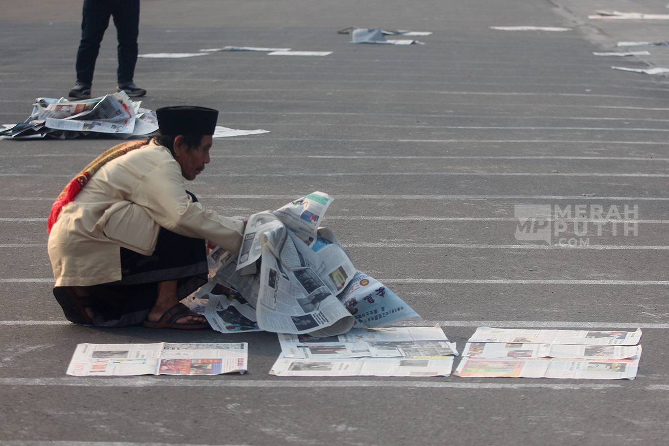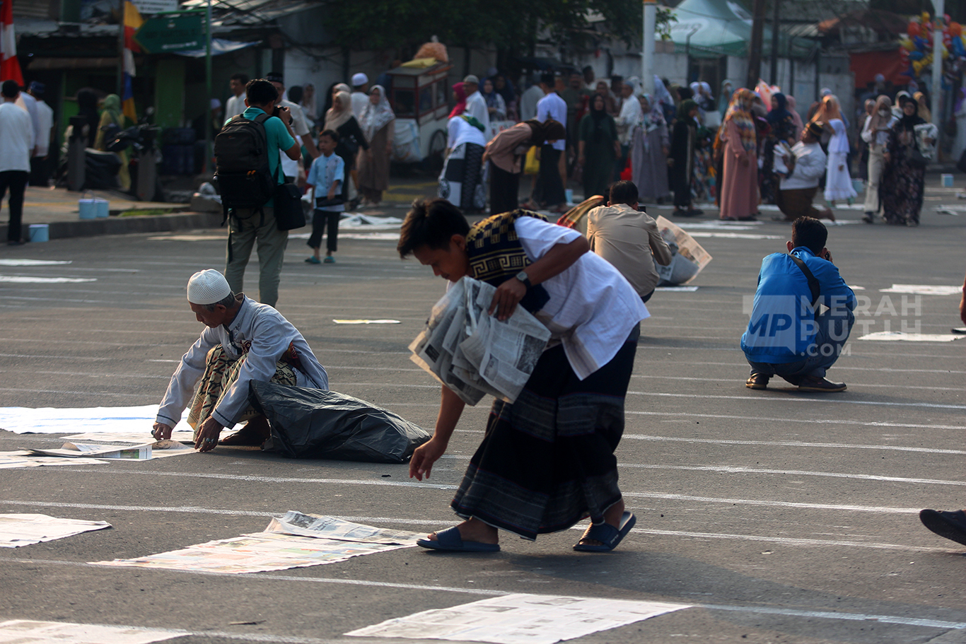 MerahPutih.com Warga bersihkan koran bekas usai Salat Idul Adha 10 Zulhijjah 1445 Hijriyah berjemaah di Jalan Jatinegara Barat dan Jalan Matraman Raya, Jatinegara, Jakarta, Senin (17/6/2024).