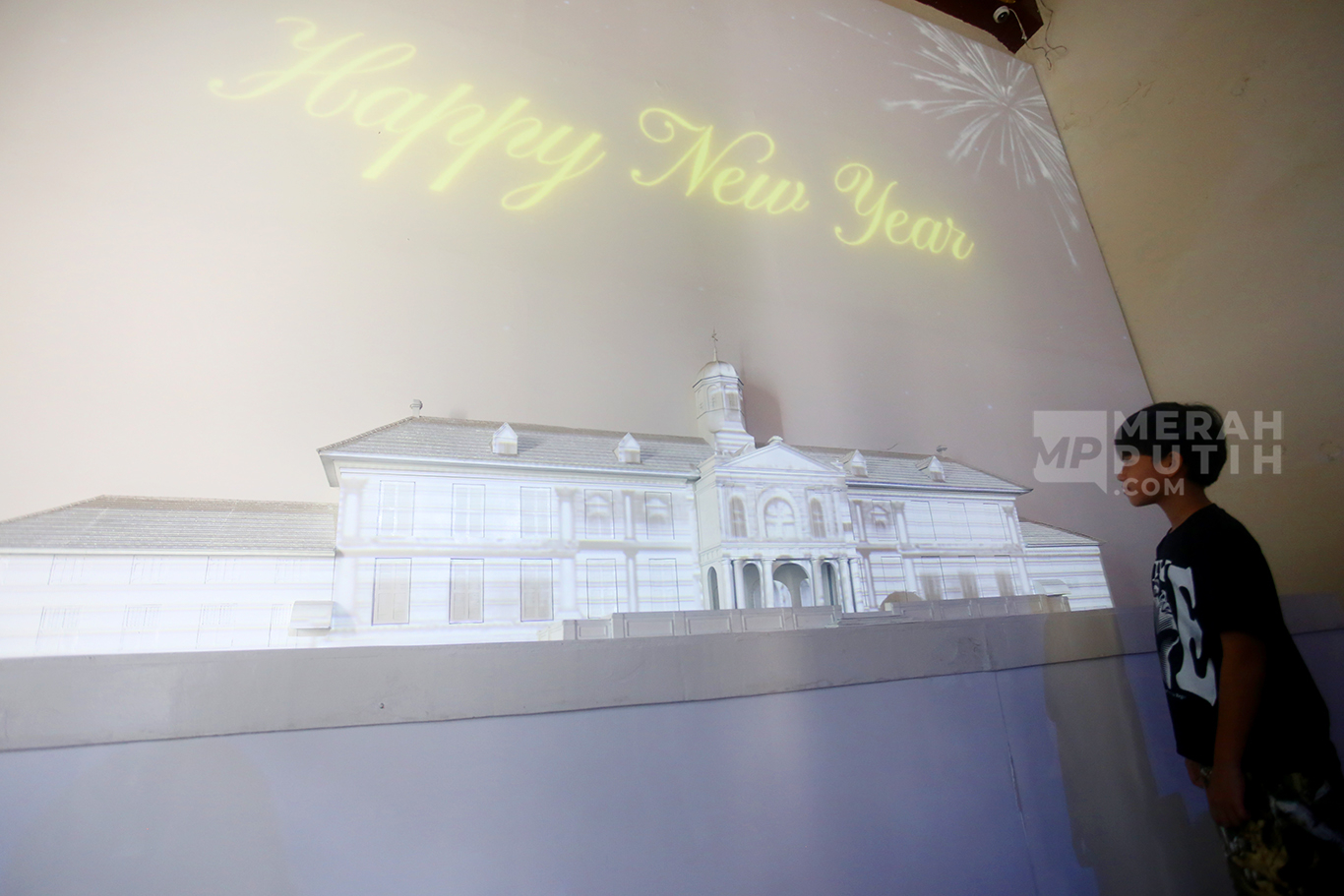 Merahputih.com - Pengunjung menyaksikan video mapping bertuliskan Selamagt Tahun Baru di Gedung Museum Fatahillah, Pinangsia, Taman Sari, Jakarta Barat(31/12/2025).