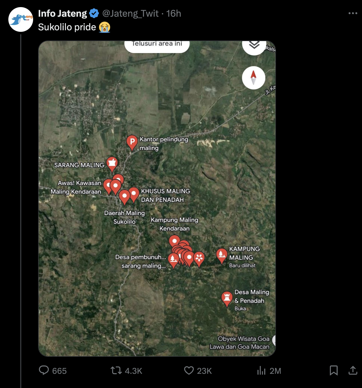 “Desa Maling dan Penadah, Kampung Maling, Desa Pembunuh dan Sarang Maling, Kampung Maling Kendaraan, Daerah Maling Sukolilo, Khusus Maling dan Penadah, Daerah Maling Sukolilo, Awas! Kawasan Maling Kendaraan, Sarang Maling, Kantor Pelindung Maling, Khusus Maling dan Penadah,” tampak tangkapan layar Google Maps satelit akun @Info Jateng, Rabu (13/6).