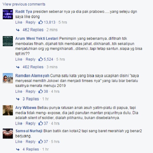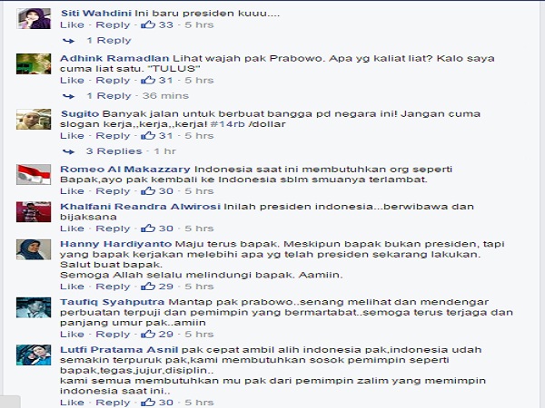 Berikut puji-pujian buat Prabowo yang di-screenshot merahputih.com dari facebook Prabowo Subianto: