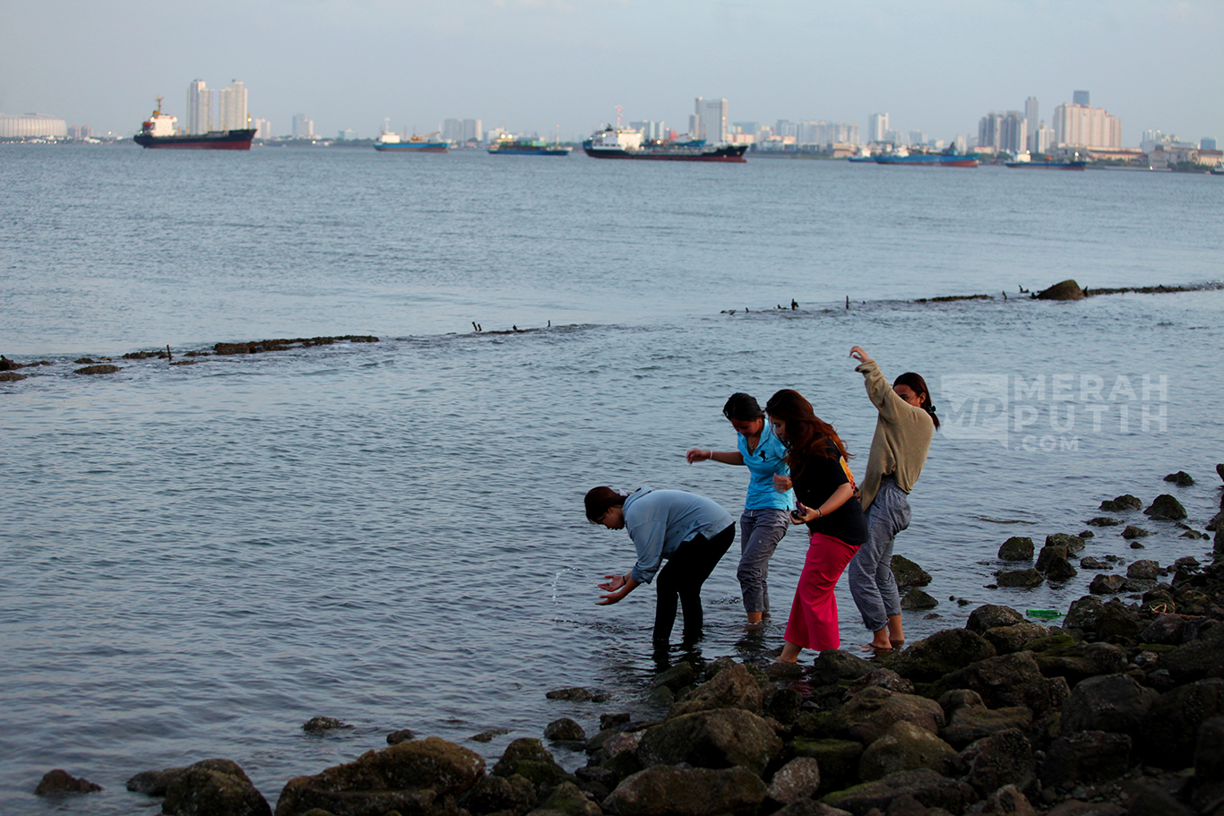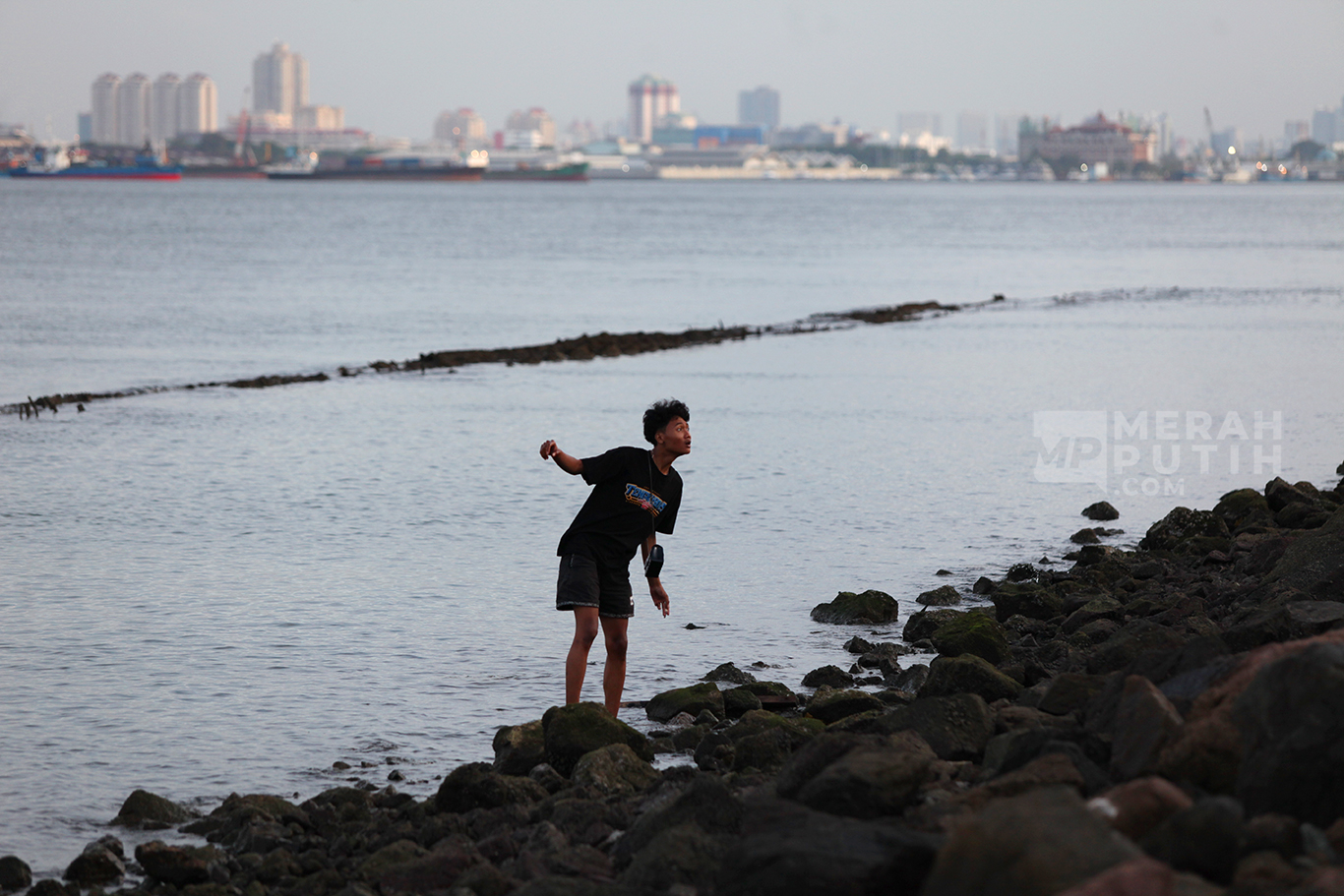 Merahputih.com - Warga bermain air saat sore hari di Tanggul Laut Muara Baru, penjaringan, Jakarta Utara, Jum'at (13/12/2024).