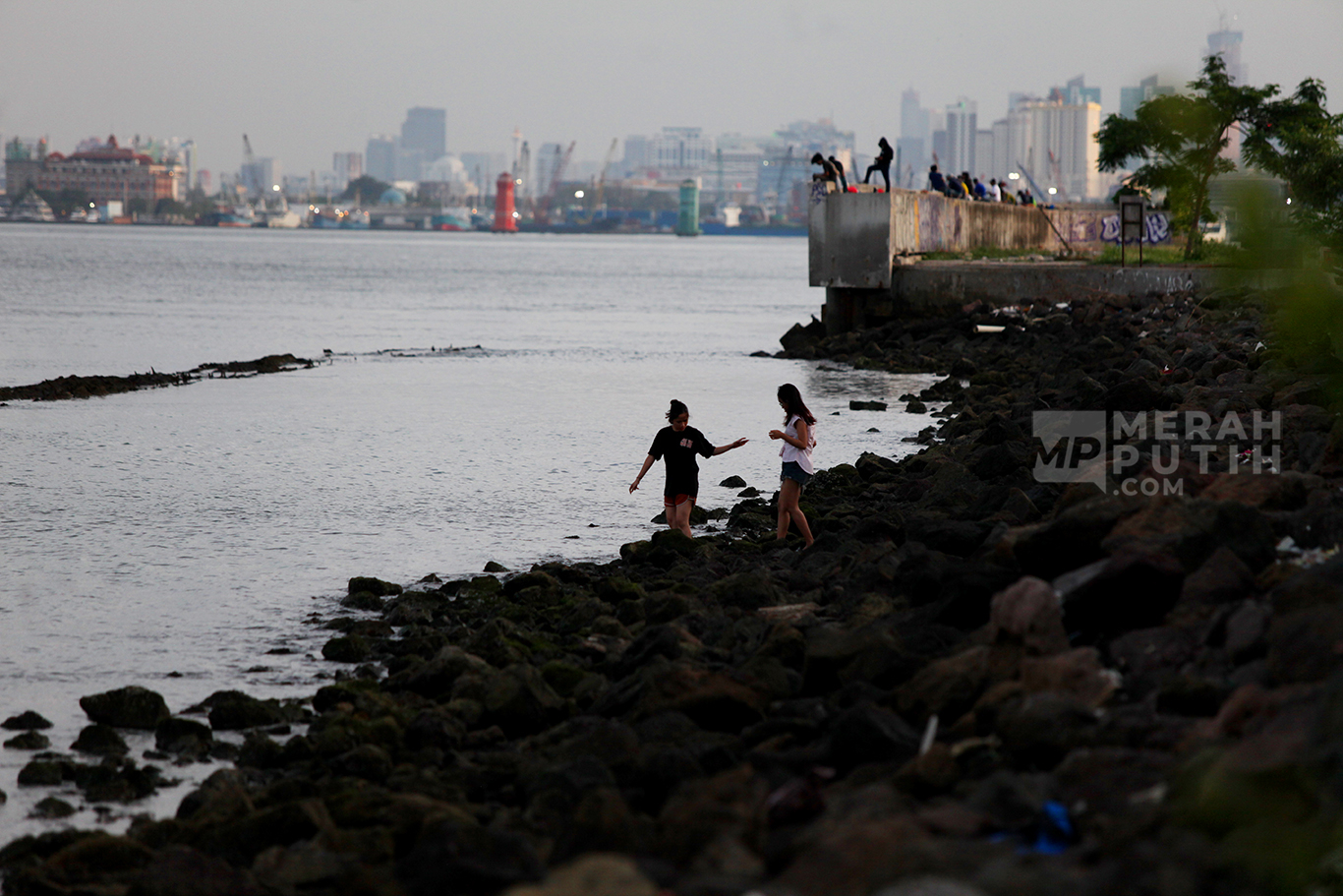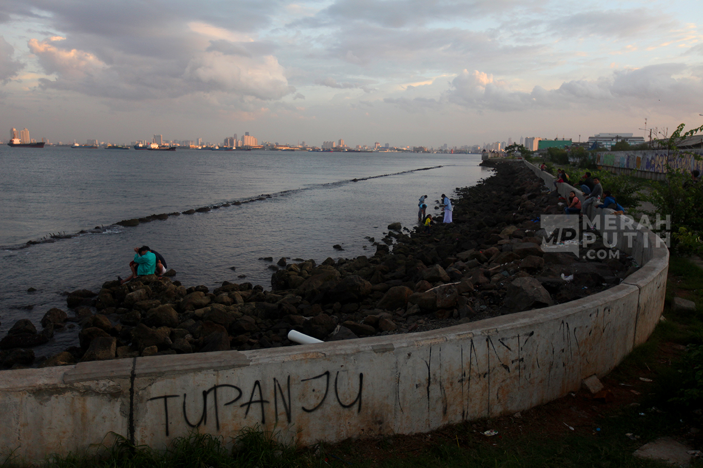 Kawasan Penjaringan, Jakarta Utara sebagian besar berada di bawah permukaan air laut sehingga jika terjadi pasang air laut maka akan masuk ke daratan atau banjir rob. Lokasi tanggul laut kerap menjadi lokasi wisata saat air laut surut. (MP/Didik Setiawan).