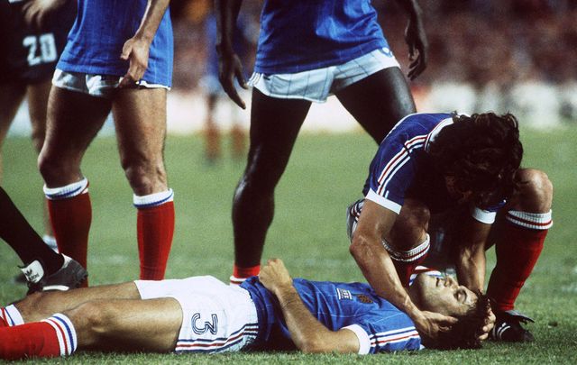 Battiston bersiap menyambut bola umpan lambung Platini, namun kiper Jerman Barat Toni Schumacher keluar dari sarangnya. Benturan kedunya pun tak bisa dihindari.